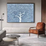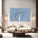 On a textured blue expanse,A lone tree stands, a silent dance.Branches bare, yet full of might,In solitude, it tells its light.