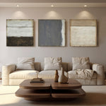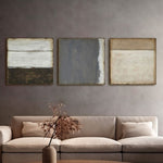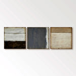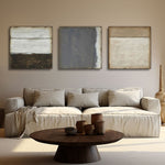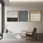 A serene triptych capturing the essence of minimalist abstraction, where each canvas explores the subtle interplay of light, texture, and earthy tones.
